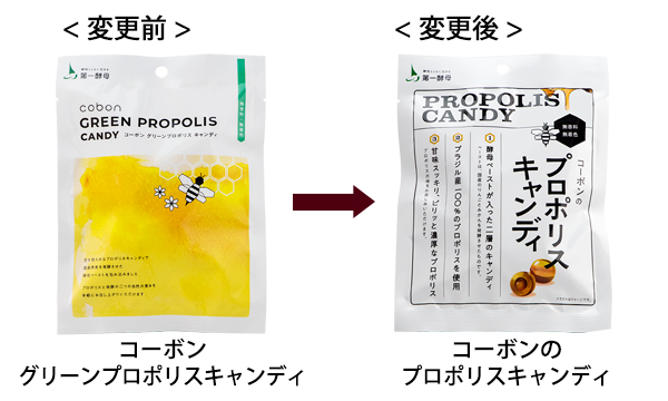 この度、「コーボングリーンプロポリスキャンディ」(税込345円/28g入り)の商品名・パッケージを在庫限りで変更することとなりました。